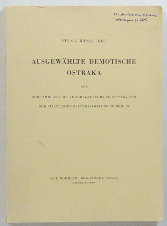 Uppsala; AB L. Norblads bokhandel (in distribution), 1954. Diss. 26,5x19 cm. xii, 248, (1, 1 blank) pp. + 15 plates. Original printed wrappers. Spine ends are a bit chipped, and there are a few small specka on the wrappers. Contents are fine. Inscribed by the author to Christos Tsiparis (1937-2021), doctor of Classical Greek.
