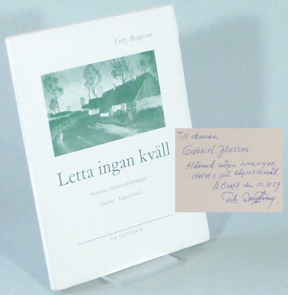Malmö; Framtidens Förlag, 1959. Originalupplaga. 20,5x15 cm. 107, (1) s. Häftad med tryckt omslag. Det överdimensionerade omslaget är aningen veckat i yttre resp. nedre marginalerna, samt har ett riss i båda nedre falsar. Fint ex. Innehåller både historier och dikter. Dedikation: ""Till vännen Gabriel Jönsson / Härmed några övningar, delvis på Kågerödsmål / Å. Össjö den 10.11.59 / Fritz Bengtsson"". Jönsson har gjort ett mindre antal blyertsmarkeringar och -rättelser.