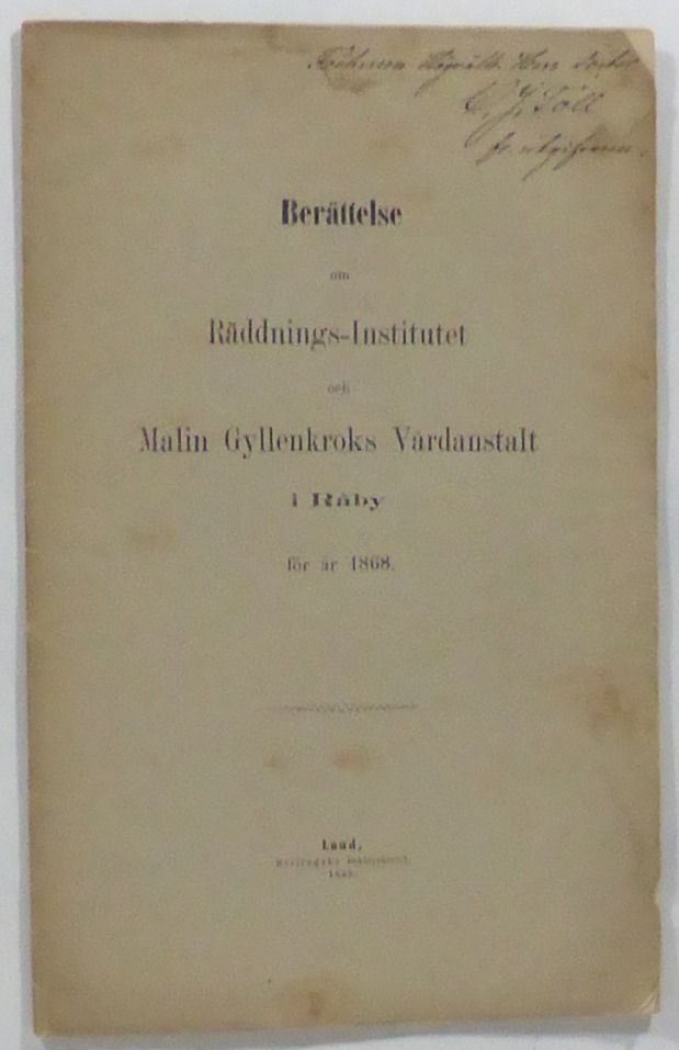 Berättelse om Räddnings-Institutet och Malin Gyllenkroks Vårdanstalt i Råby för år 1868.
