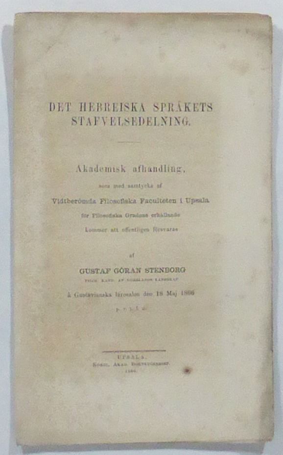Uppsala; Kongl. Akad. boktr., 1866. Diss. 22,5x14 cm. 18 s. Utan omslag. Ouppskuren. Genomgående lätt fläckad samt med en genomgående fuktrand vid övre inre hörnet. Without wrappers. Unopened. All leaves are slightly spotted and have a faint dampstain at top inner corner. Swedish dissertation on the Hebrew language.