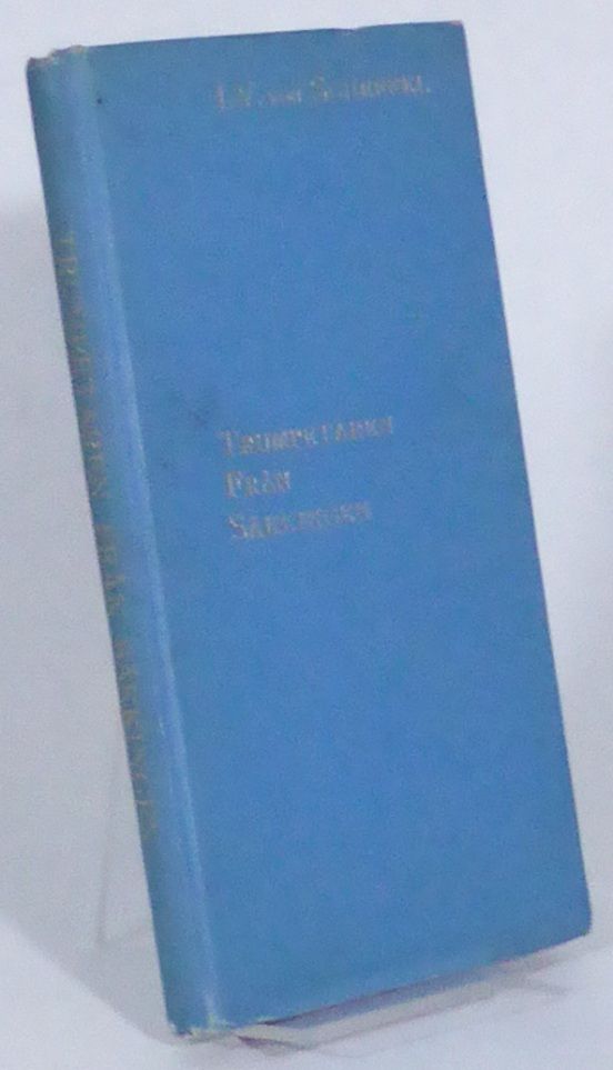 Stockholm; Chelius & Co., 1901. Originalets titel: Der Trompeter von Säckingen. Ein Sang von Oberrhein (Stuttgart, 1854). 21x11 cm. (4), 228 s. Förlagets blå klotband med förgylld titel på rygg och främre pärm, röda snitt och mönstrade försättsblad. Främre häftesomslaget medbundet. Ryggändar och nedre pärmhörnen något tilltryckta, samt ett par mindre tryckmärken överst på främre pärm. Bandet aningen solkat. Främre omslaget med en understrykning i rött bläck samt en liten mörk prick. Inlagan med ett fåtal spridda småfläckar. Första svenska utgåvan.