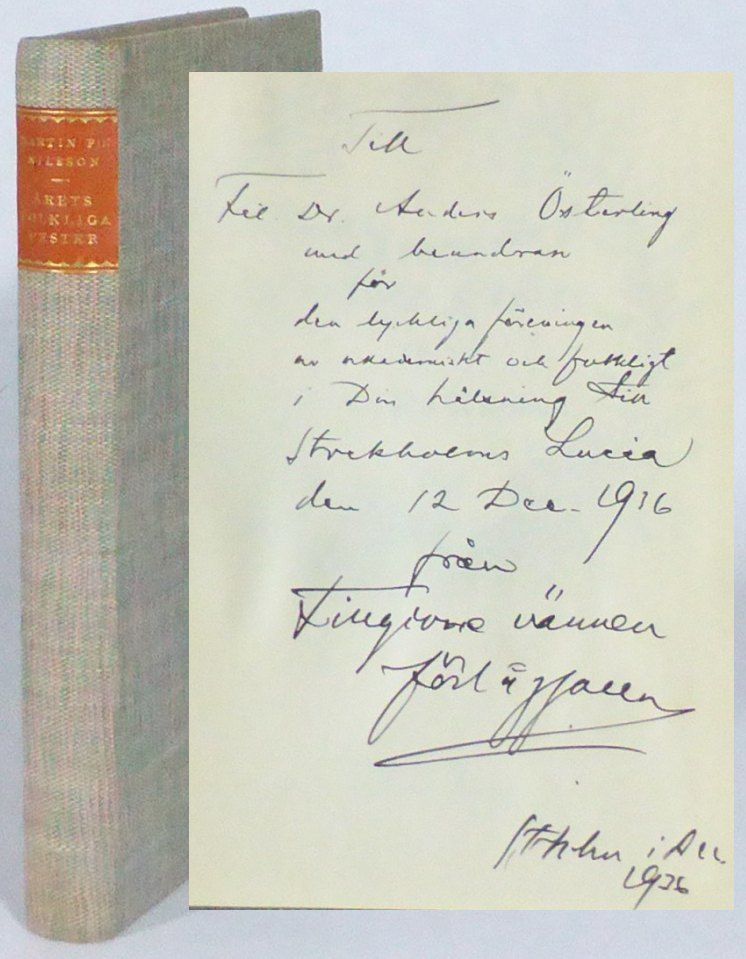 Stockholm; Hugo Gebers, 1936. 22x15 cm. 311, (1 blank) s. + 10 planschblad. Förlagets linneband med ryggetikett i rött skinn, marmorerade snitt och försättsblad. Främre omslag medbundet, detta aningen gulnat. Fint ex. Skildrar bl. a. julfirandet, skördefester, majbröllop, karnevaler och påsken. Gåvotillskrift från förläggaren till Anders Österling på främre försättsblad.