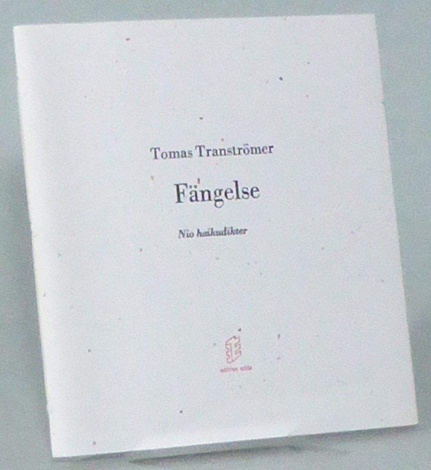 Uppsala; Edition Edda, 2001. Originalupplaga. 16x14,5 cm. Opaginerad (15, 17 blanka s). Häftad med tryckt vikomslag. Fint ex. Upplaga 2000 ex, varav 100 numrerade och signerade. Detta exemplar tillhör den onumrerade delen av upplagan. ""1959 besökte Tomas Tranströmer sin vän psykologen och poeten Åke Nordin som då var anstaltschef på Hällby ungdomsfängelse utanför Eskilstuna. Som nyårshälsning sände Tranströmer samma år åtta haikudikter till Åke Nordin och hans hustru Ulla. Dessa trycks här för första gången följda av en nionde haiku, som av någon anledning inte kom med i brevet."" First edition of Tranströmer's ""Prison"", which comprises nine haikus, written in 1959 when the author worked at Hällby Young Offenders' Prison. Printed in an edition of 2000 copies, of which 100 were numbered and signed by the author. This is one of the 1900 unnumbered copies. A very fine copy.