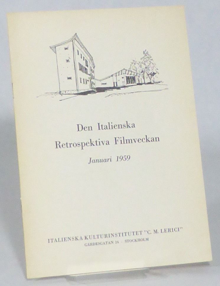 Stockholm; Italienska kulturinstitutet ""C. M. Lerici"", 1959. 21x14,5 cm. 7, (1) s. Klammerhäftad med tryckt omslag. Fint ex. Presentation av de sammanlagt 30 filmer som visades under filmveckan. Bland filmerna återfanns bland andra Giovanni Pastrones ""Cabiria"", Michelangelo Antonionis debut ""Cronaca di un amore"", filmen om Gabriele d'Annunzios propaganda-flygfärd, ""Volo su Vienna,"" samt Filoteo Albertinis ""La presa di Roma"".