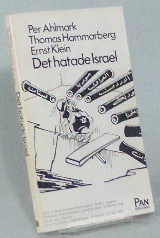 Stockholm; PAN/Norstedts, 1970. 19x11,5 cm. 160, (1, 1 blank) s. Originalpocket. Bakre omslag något solkat, med hörnveck upptill samt en liten förlagsstämpel. Ur Per Gahrtons bibliotek och med hans namnteckning på halvtitelbladet. Gahrton har gjort en hel del understrykningar och utropstecken i bläck, samt ett fåtal kommentarer. Gahrton, vid den här tiden ordförande för Folkpartiets Ungdomsförbund, gav tidigare samma år ut boken ""Kampen om Palestina. En kritisk analys av sionism och arabnationalism"". En serie ganska hätska debatter mellan Gahrton och Ahlmark/Klein/Hammarberg i radio och TV kring Israel/Palestina följde. Gahrton menar i sina memoarer (""Motvalls. Med liberalismens frihetstörst i hjärtat"" s. 183) att Ahlmarks syfte med denna boks publicering var att undergräva hans ställning som FPU-ordförande.