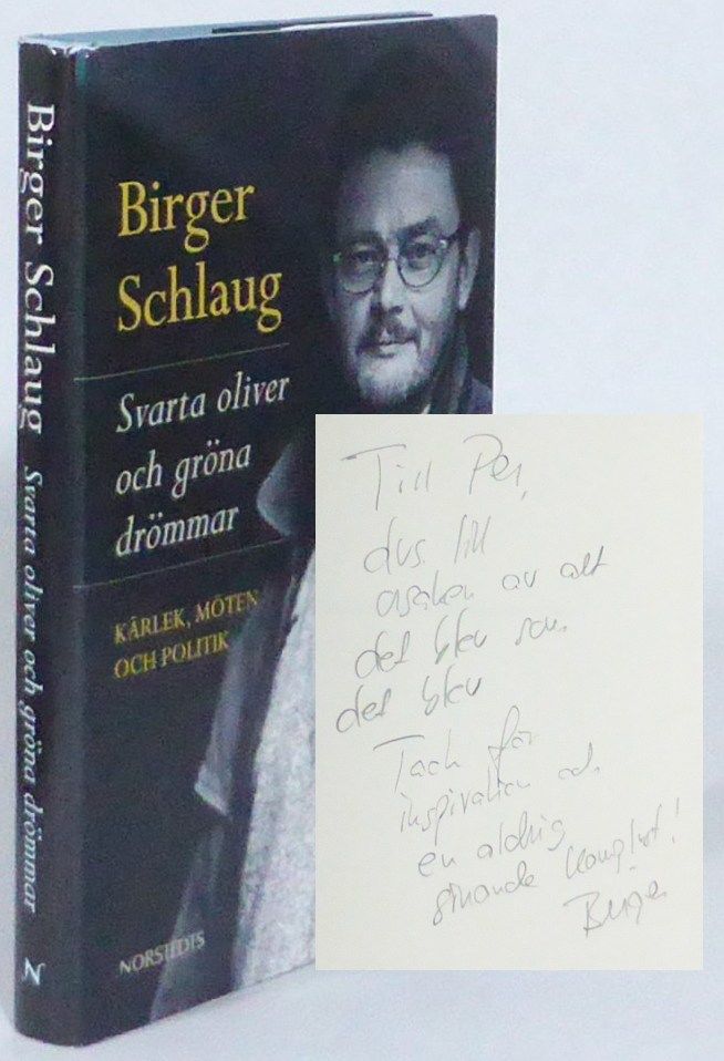 Stockholm; Norstedts, 1997. 21,5x14 cm. 251, (1) s. Förlagets pappband med tryckt skyddsomslag. Omslaget obetydligt nött och rygghuvudet aningen tilltryckt. Övre snittet lätt fläckat. Fint exemplar av Schlaugs memoarbok. Dedikation: ""Till Per [Gahrton], dvs. till orsaken av att det blev som det blev. Tack för inspiration och en aldrig sinande kamplust! / Birger"". Schlaug tog över rollen som språkrör för Miljöpartiet efter Gahrton 1985.