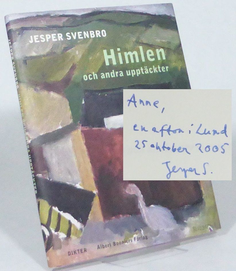 Stockholm; Bonniers, 2005. Originalupplaga. 20x16 cm. 73, (1) s. Förlagets pappband med dekorerat skyddsomslag. Kort reva nederst på skyddsomslagets främre panel. Fint ex. Dedikation: ""Anne, en afton i Lund 25 oktober 2005 / Jesper S."" Mottagare var Anne de Laval Wipp, gift med konstnären John Wipp.