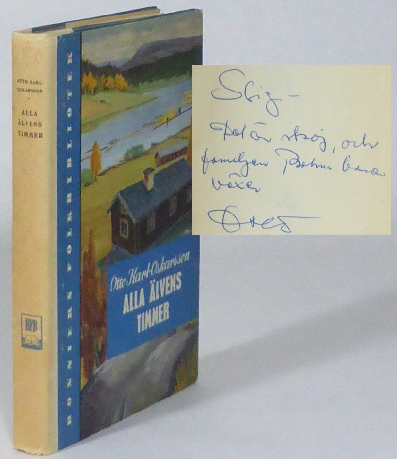 Stockholm; Bonniers, 1949. (Bonniers folkbibliotek). Originalupplaga. 19x12,5 cm. 255, (1) s. Förlagets klotryggband med tryckt skyddsomslag. Omslaget är aningen naggat och solkat, samt mörknat och med svaga fuktringar på ryggen. Lätt tilltryckt rygghuvud. Främre snittet lite fläckat. Svenskt litteraturlexikon skriver: ""Här lyckas han med den svåra uppgiften att bygga upp en romanhandling kring få personer agerande under kort tidrymd. Det är ett triangeldrama i ett småbrukarhem... Alla älvens timmer är ett vardagsdrama i romanform, och det är en av den nya 'norrlandsskolans' allra bästa böcker."" Dedikation till Stig Carlson: ""Stig - det är skoj, och familjen Bohm bara växer / Otto"". Fin association mellan de båda arbetarförfattarna. Carlsson var verksam som recensent vid Motala Tidning samt Arbetet och gav arbetarlitteraturen stort utrymme.