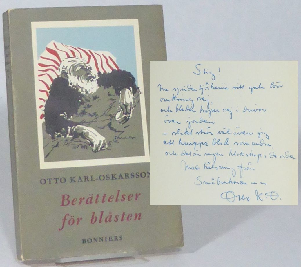 Stockholm; Bonniers, 1953. Originalupplaga. 19,5x13 cm. 279, (2, 1 blank) s. Häftad med tryckt omslag. Omslag av Yngve Svalander. Förlagsstämpel på sista blanka bladet. Det överdimensionerade omslaget är aningen veckat i nedre marginalen samt vid ryggändarna. Limfläckar på bakre omslag. Bra ex. Samling av nio noveller, bl. a. titelnovellen, ""Hunden Dante"", ""Älgjakt"" och ""Att vara byskrivare"". Dedikation till Stig Carlson: ""Stig! Nu sprider björkarna sitt gula löv omkring sej, och bladen hopar sej i drivor över jorden - slikt strör väl även jag ett knippe blad som andra, och det är ingen klokskap i de orden / Med hälsning från Småbrukaren m. m. Otto K-O"". Fin association mellan de båda arbetarförfattarna. Carlsson var verksam som recensent vid Motala Tidning samt Arbetet och gav arbetarlitteraturen stort utrymme.