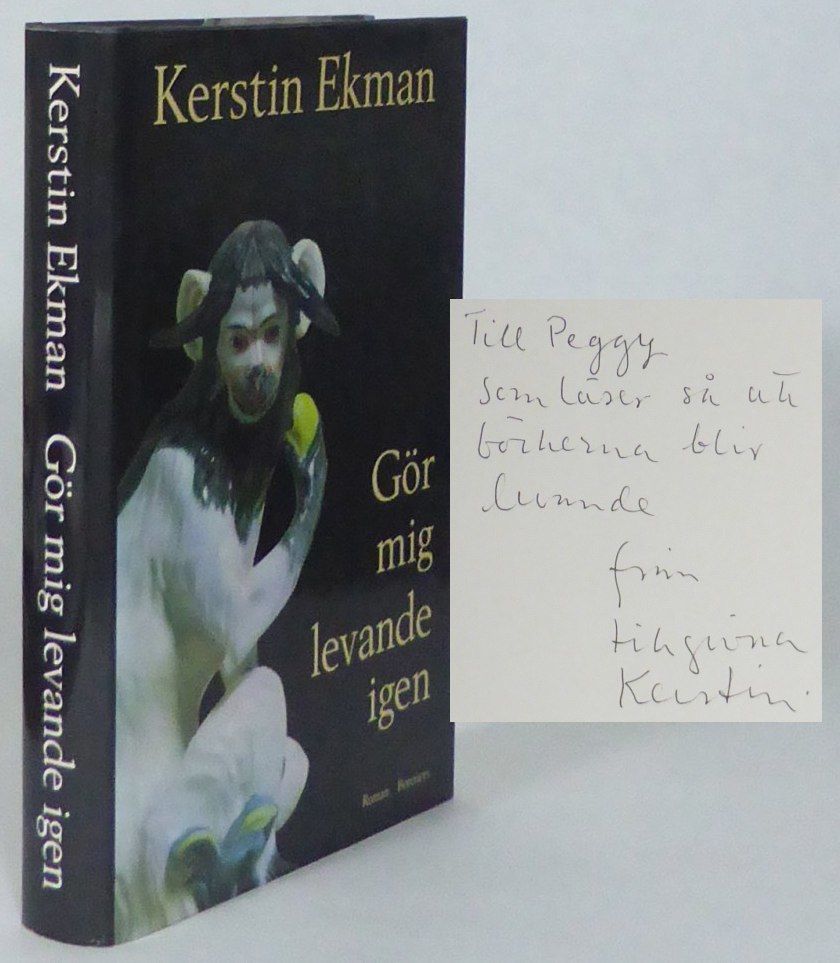 Stockholm; Bonniers, 1996. Originalupplaga. 23,5x16 cm. 525, (1) s. Förlagets pappband med tryckt skyddsomslag. Några små skrynklor på skyddsomslaget. Fint ex. Dedikation till förläggaren Peggy Bonnier: ""Till Peggy som läser så att böckerna blir levande / från tillgivna Kerstin"".