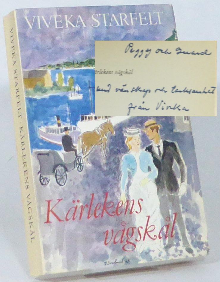 Stockholm; Bonniers, 1963. Originalupplaga. 22,5x14,5 cm. 288, (1, 1 blank) s. Häftad med tryckt omslag. Omslag av Yngve Svedlund. Lätt snedläst. Det överdimensionerade omslaget är aningen veckat i yttre och nedre marginalen. Fint ex. Dedikation till förläggarna Gerard och Peggy Bonnier: ""Peggy och Gerard med vänskap och tacksamhet från Viveka"".