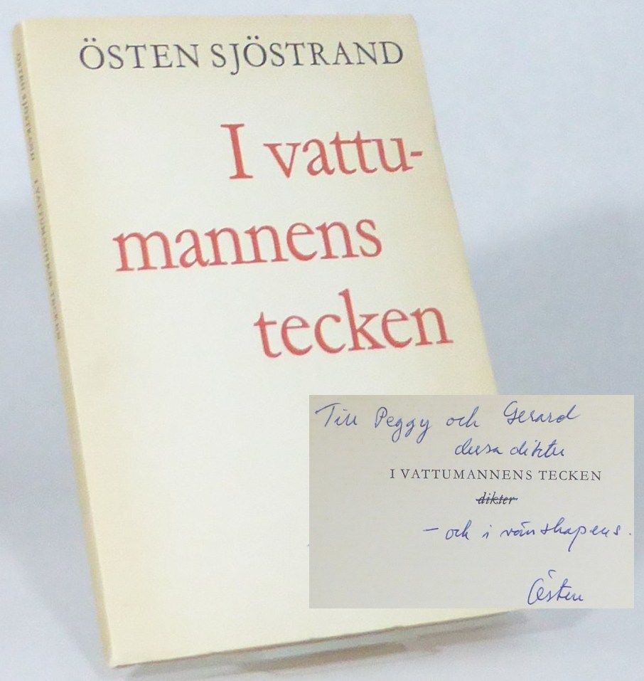 Stockholm; Bonniers, 1967. Originalupplaga. 24x16,5 cm. 102, (4, 2 blanka) s. Häftad med tryckt omslag. Det överdimensionerade omslaget är aningen veckat i yttre och nedre marginalen. Med ett riss i bakre omslagets yttermarginal. Bra ex. Dedikation till förläggarna Gerard och Peggy Bonnier: ""Till Peggy Och Gerard / dessa dikter [I vattumannens tecken] -- och i vänskapens. / Östen"".