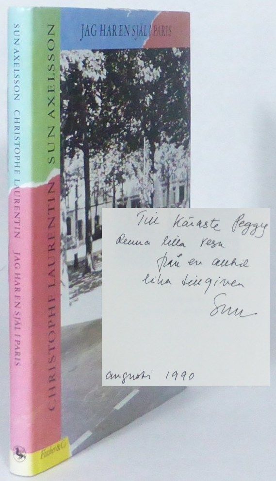 Stockholm; Fischer & Co., 1990. Originalupplaga. 26,5x21 cm. 142, (2) s. Förlagets pappband med tryckt skyddsomslag. Några riss i skyddsomslaget. Rygghuvudet aningen tilltryckt. Bra ex. ""Sun Axelsson har en gång förlorat sin själ till Paris -- om det berättar hon här, om sitt Paris, till fotografen Christophe Laurentins bilder."" Med dedikation från Axelsson till förläggaren Peggy Bonnier: ""Till käraste Peggy / Denna lilla resa från en alltid lika tillgiven Sun / augusti 1990"".