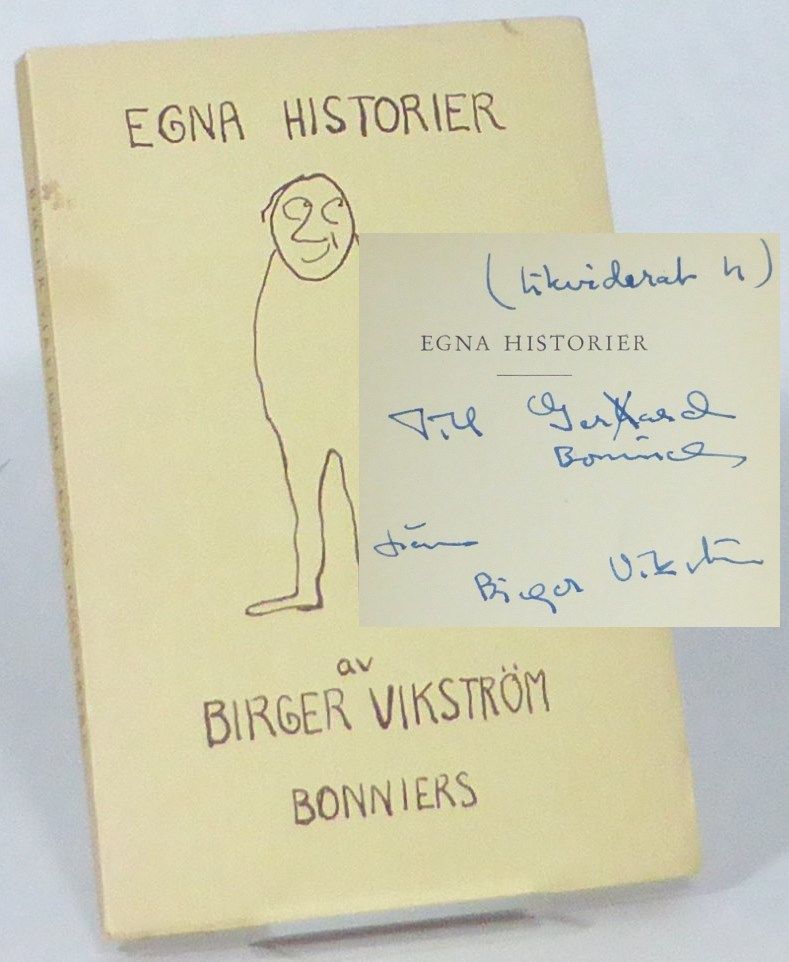 Stockholm; Bonniers, 1953. Originalupplaga. 19,5x13 cm. 122, (2, 2 blanka) s. Häftad med tryckt omslag. Med omslag av författaren. Det överdimensionerade omslaget är aningen veckat I nedre marginalen. Främre omslag med några små fläckar. Bra ex. Innehåller bl. a. ""Bland de serbiska bergen"", ""Surmjölk"" och ""Mina svårigheter som schackspelare"". Dedikation till förläggaren Gerard Bonnier: ""(likviderat h) / Till Gerhard [överstruket h] Bonnier från Birger Vikström"".