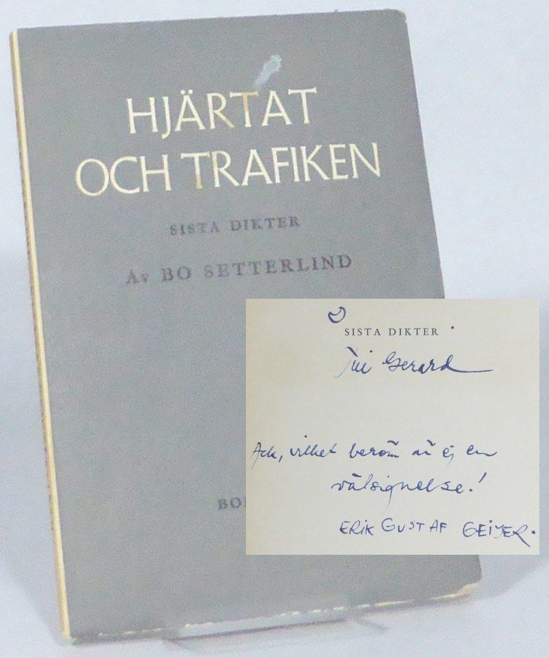 Stockholm; Bonniers, 1951. Originalupplaga. 20,5x14 cm. 82, (5, 1 blank) s. Häftad med tryckt omslag. Svaga fuktringar på ryggen. Ett par fläckar samt ett riss på främre omslag. Liten hörnförlust nedtill på båda paneler. Dedikation med ritad måne till förläggaren Gerard Bonnier: ""[Sista dikter] till Gerard / Ack, vilket beröm är ej en välsignelse! / Erik Gustaf Geijer"".