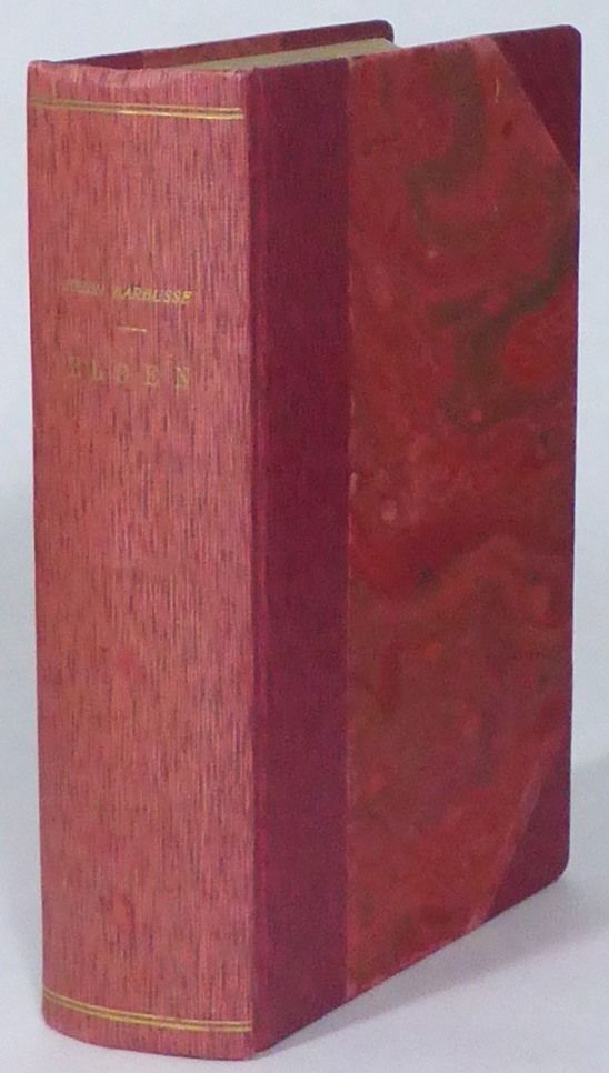 Stockholm; Norstedts, 1917. Originalets titel: Le feu. Journal d'une escouade (Paris, 1916). 19x13 cm. 251, (1) & 263, (1) s. Samtida rött halvklotband med förgylld ryggtitel, marmorerade pärmpapper och försättsblad. Omslag ej medbundna. Namnteckning på första delens halvtitelblad (Arvid Lund / nov. 1917) samt exlibris med initialerna ""G. A. L."". Lätt tilltryckta ryggändar. Inlagan med ett fåtal spridda små mörka prickar. Fint ex. Första svenska utgåvan. Författarens genombrottsroman och en av de viktigaste skildringarna av Första världskriget.