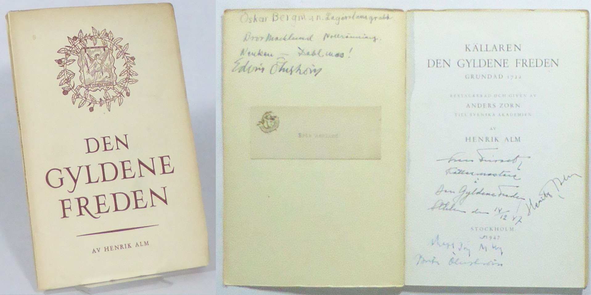 Stockholm, 1947. 22,5x15,5 cm. (2 blanka), 40 s. + 12 planschblad med fotografier av Staffan J. Kronberg. Häftad med tryckt omslag. Omslag av Iwan W. Fischerström. Omslaget lätt solkat samt med några korta revor. En tunn remsa från insidan av främre omslag har fastnat i titelbladets inre marginal. Några små hörnveck. Hyfsat exemplar av skriften som gavs ut till 25-årsjubileet av den nyöppnade inrättningen, vilket även firades med en fest 14 december samma år. Föreliggande exemplar har vid festen signerats av bl. a. källarmästaren Sven Frisack, Henrik Alm, konstnären Oskar Bergman, skulptörerna Bror Marklund och Edvin Öhrström. Ett tryckt exlibris med Den Gyldene Fredens logotyp samt ""Erik Asklund"" i maskinskrift. Troligen fick Den Gyldene Fredens stamgäster, till vilka Asklund hörde, varsitt exemplar av boken vid tillfället.