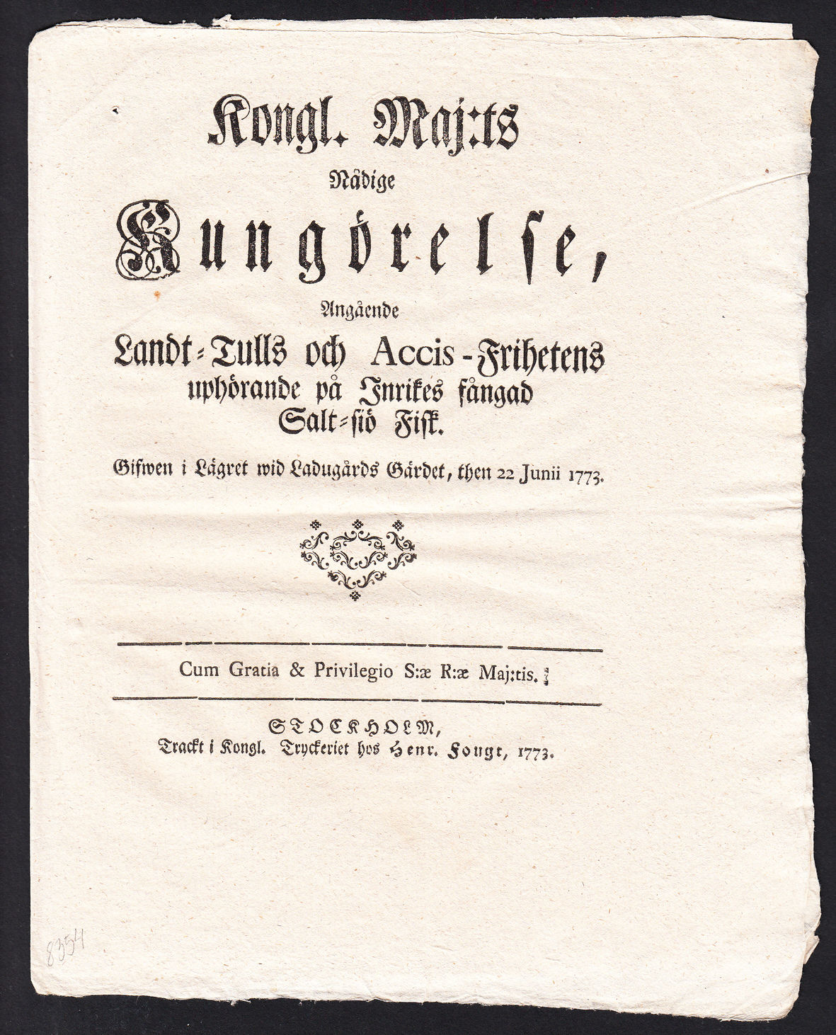 Kongl. Maj:ts Nådige Kungörelse, Angående Landt-Tulls och Accis-Frihetens uphörande på Inrikes fångad Salt-siö Fisk. Gifwen i Lägret wid Ladugårds Gärdet, then 22 Junii 1773.