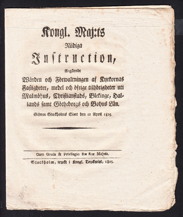 Kongl. Maj:ts Nådiga Instruction, Angående Wården och Förwaltningen af Kyrkornas Fastigheter, medel och öfrige tilhörigheter uti Malmöhus, Christianstads, Blekinge, Hallands samt Götheborgs och Bohus Län. Gifwen Stockholms Slott den 12 april 1815.