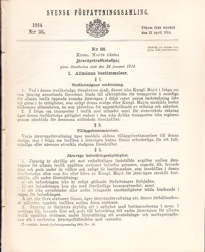 Kungl. Maj:ts nådiga järnvägstrafikstadga; given Stockholm slott den 24 januari 1914. (Svensk författningssamling 1914, N:r 36).