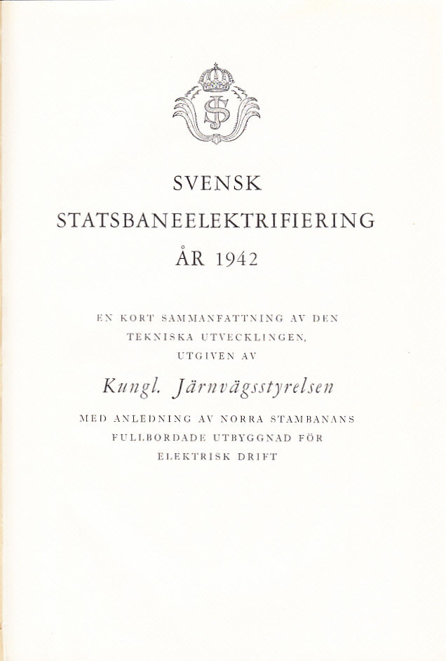 Svensk statsbaneelektrifiering år 1942. En kort sammanfattning av den tekniska utvecklingen. Med anledning av Norra Stambanans fullbordade utbyggnad för elektrisk drift.