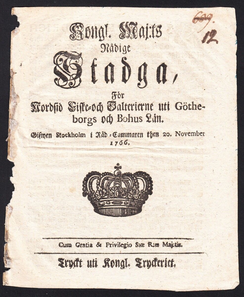 Kongl. Maj:ts Nådige Stadga, För Nordsiö Fiske- och Salterierne uti Götheborgs och Bohus Län. Gifwen Stockholm i Råd-Cammaren then 20. November 1766.