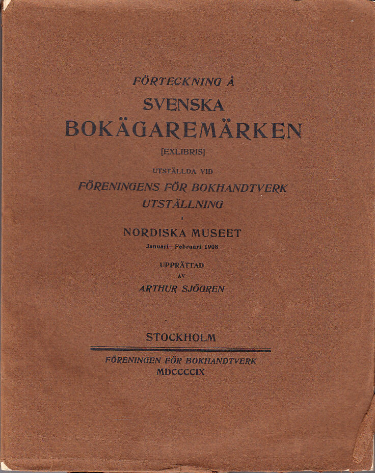 Förteckning å svenska bokägaremärken [exlibris] utställda vid Föreningen för Bokhandtverk utställning i Nordiska museet Januari - Februari 1908 upprättad av Arthur Sjögren.