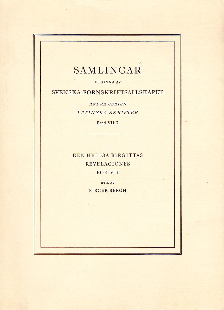 Samlingar utgivna av Svenska fornskriftsällskapet. Ser. 2. Latinska skrifter. Band VII:7. Innehåll: Ad lectorem; Förteckning över källor och förkortningar; Texthistorisk inledning; Tilläggsmaterialet; Övriga handskrifter; Handskriftstraditionens äldsta förgrening; Editionsprinciper; Textkritiska anmärkningar; Reuelacionum liber septimus: text med kritisk apparat; Glossarium; Index personarum; Index geographicus; Index rerum et locutionum; Summary.