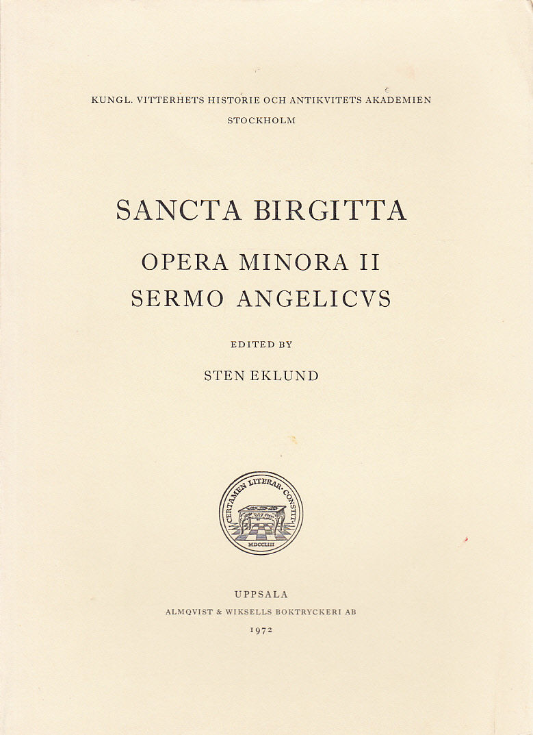 Sancta Birgitta Opera Minora II sermo angelicvs. [Utg. av] Kungl. Vitterhets historie och antikvitets akademien, Stockholm.