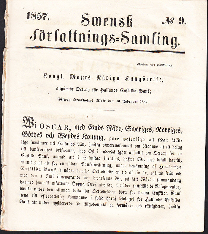 Quiding ‘Svenskt allmänt författningsregister ...’ s. 168:23. Svensk Författnings-Samling 1857:9. Första årstrycket rörande Hallands Enskilda bank. Kontrasignerad ‘J.A. Gripenstedt’.