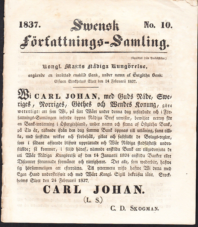Quiding ‘Svenskt allmänt författningsregister ...’ s. 519:16. Svensk Författnings-Samling 1837:10. Ej tillgänglig vid något Libris-bibliotek. Första årstrycket rörande Östgöta bank. Kontrasignerad ‘C.D. Skogman’.