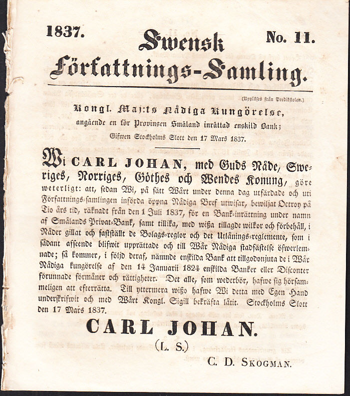 Kongl. Maj:ts nådiga kungörelse, angående en för prowinsen Småland inrättad enskild bank; Gifwen Stockholms slott den 17 mars 1837.