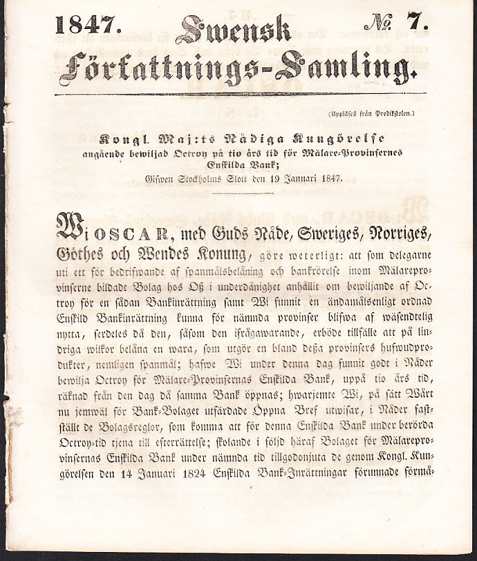 Kongl. Maj:ts nådiga kungörelse, angående bewiljad octroy på tio års tid för Mälare-provinsernas Enskilda bank. Gifwen Stockholms slott den 19 januari 1847.
