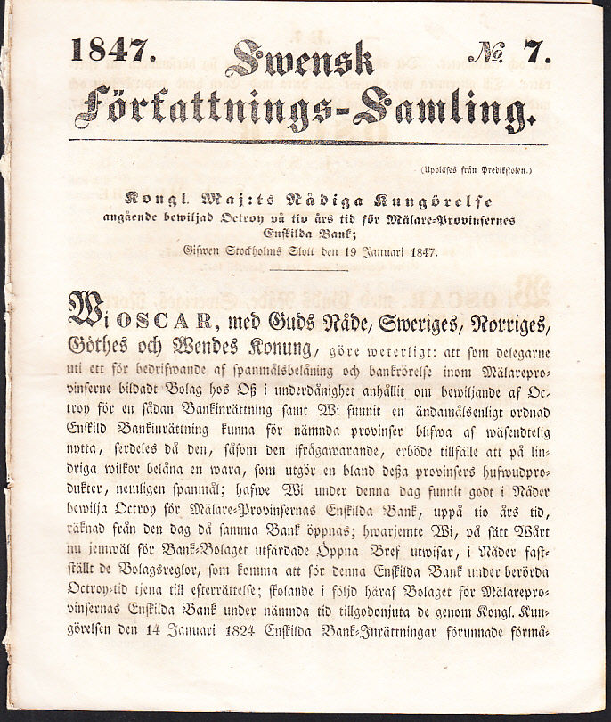 Kongl. Maj:ts nådiga kungörelse, angående bewiljad octroy på tio års tid för Mälare-provinsernas Enskilda bank. Gifwen Stockholms slott den 19 januari 1847.