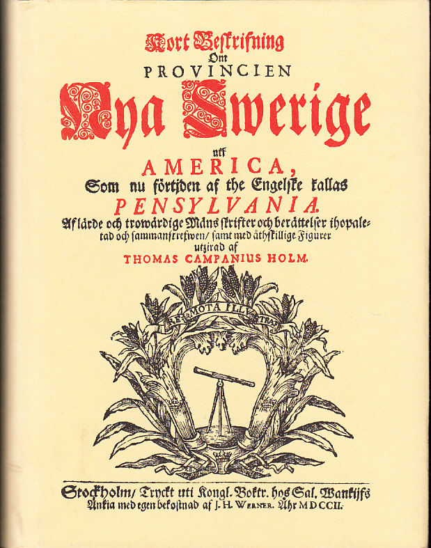 Rediviva 112. Faksimilutgåva efter originalet som utkom i Stockholm 1702. Innehåll: Om America i gemen; Om provincien Nya Swerige, eller som den nu kallas Pensylvania, uti America; Om the Americaner wid Nya Swerige eller Pensylvania; En orde- och samtals-bok på ofwan:de Americaners språk, beståendes af åthskillige små capitel och delar; Addenda (Om the myncquesser eller mynckuffas, och theras språk; Om någre märkwärdige och sällsamme ting uti America).