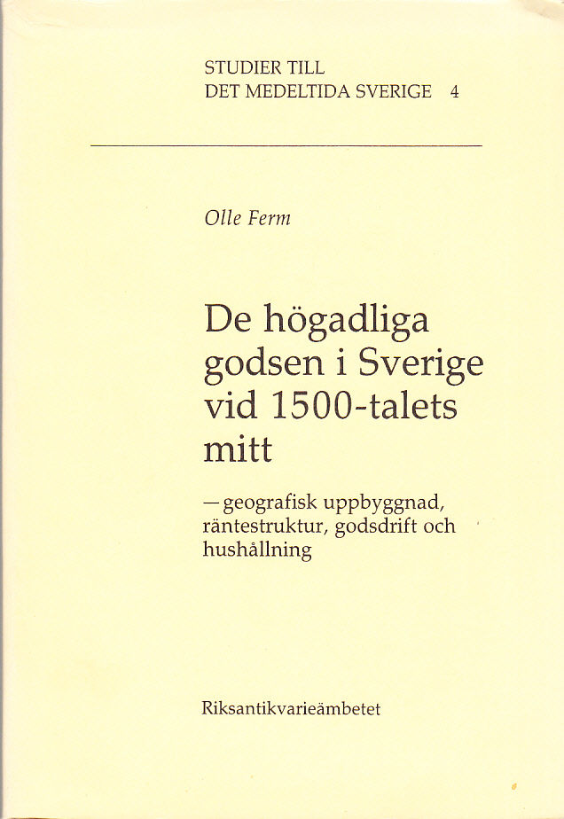 Studier till det medeltida Sverige 4. Författarens doktorsavhandling, som försvarades vid Stockholms Universitet 8 juni 1990. Innehåll: Allmän inledning; De högadliga godskomplexens uppbyggnad; Hushållning och godsdrift; Avslutning; Tabellbilaga; Summary; Referensförteckning; Register, förteckningar och förkortningar.