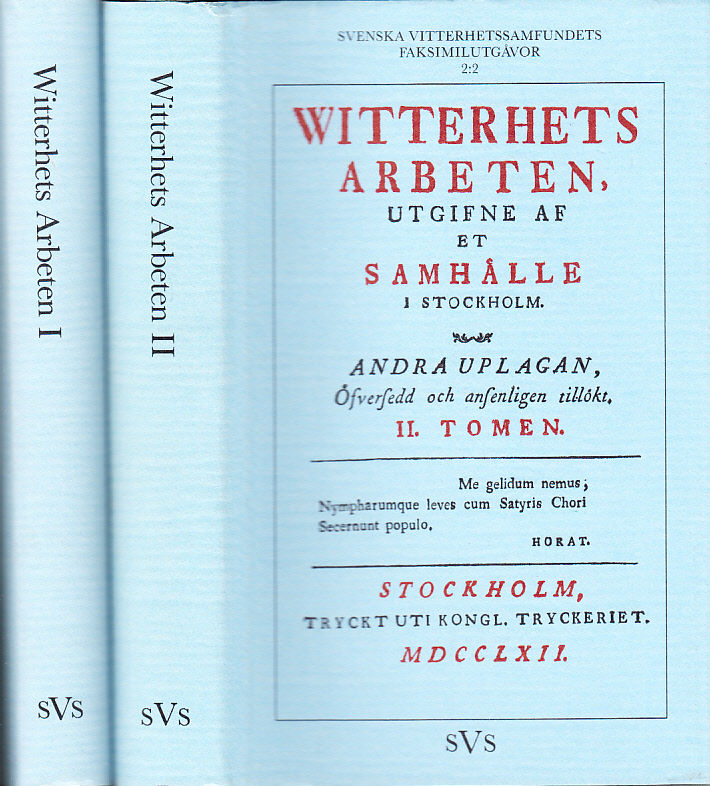 Svenska Vitterhetssamfundets faksimilutgåvor 2:1-2. Originalets titel: Witterhets arbeten, utgifne af et samhälle i Stockholm. Andra uplagan, öfversedd och ansenligen tillökt. I-II. Tomen.
