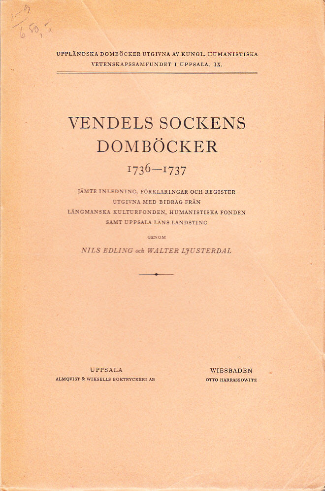 Vendels sockens domböcker 1736-1737 jämte inledning, förklaringar och register utgivna ... genom Nils Edling och Walter Ljusterdal.