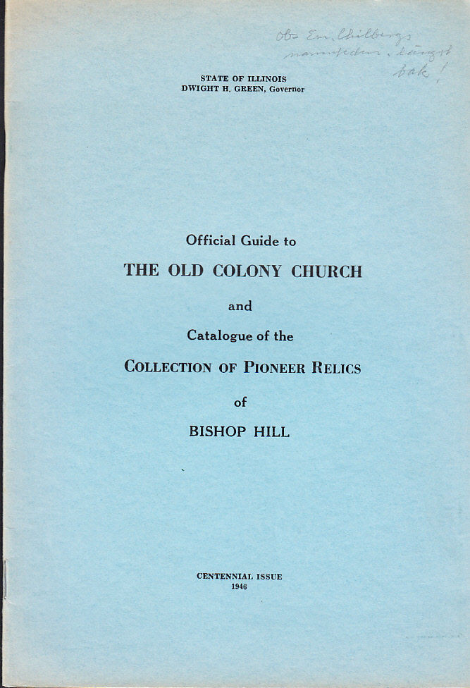 Official Guide to The Old Colony Church and Catalogue of the Collection of Pioneer Relics of Bishop Hill. [Omslagstitel].