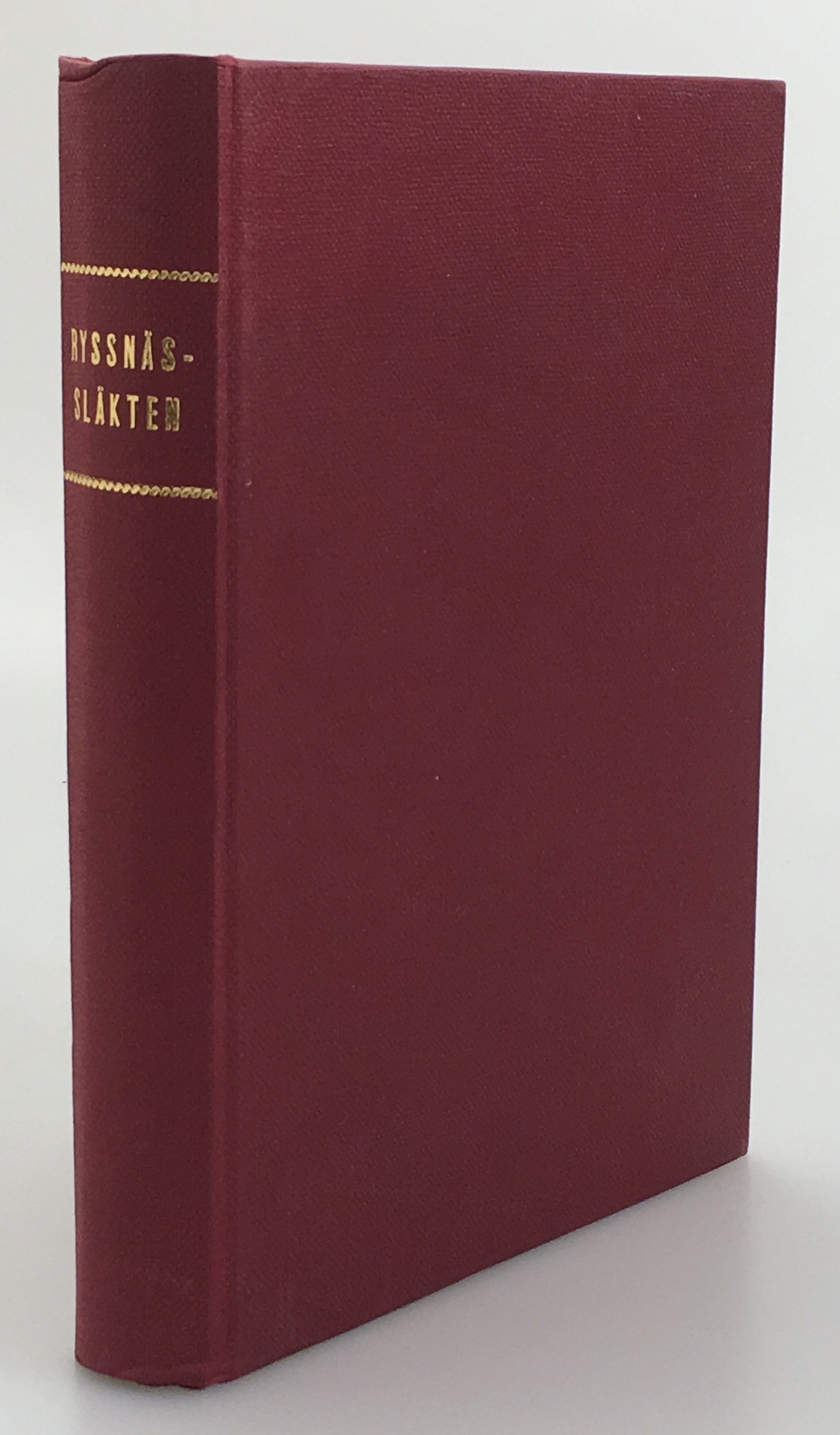 Hässleholm, Svantessons Boktryckeri, 1960. 8:o. 560 s. (inkl. 10 ant.-s.). Förlagets röda klotband med ‘Ryssnässläkten’ i guldtryck på ryggen.