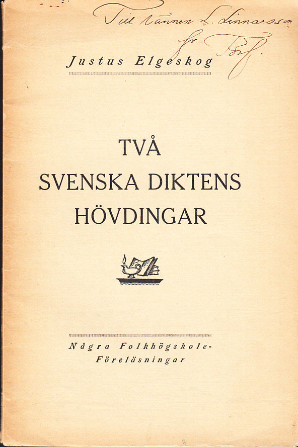 Karlskoga, Karlskoga Boktryckeri, 1923. 8:o. 48 s. Trådhäftad med styvt tryckt något solbränt pappersomslag. Författardedikation till vännen L. Linnarsson på främre omslag.