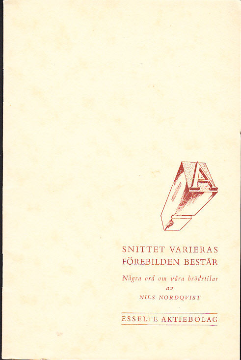 Stockholm, Esselte AB, 1939. Liten 8:o. s. 15-34. Illustrerad. Klammerhäftad med styvt tryckt pappersomslag. Författardedikation till ‘vännen Hans Küntzel med ‘bokstavliga’ och varma hälsningar’.