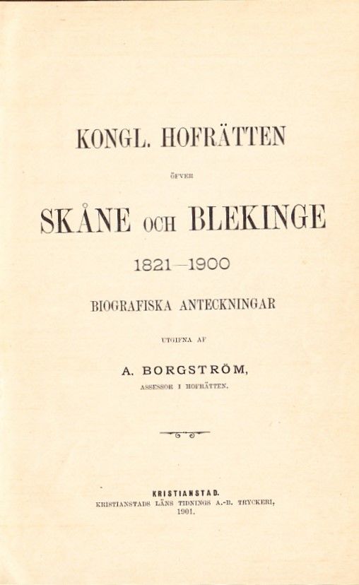 Kongl. Hofrätten öfver Skåne och Blekinge 1821-1900. Biografiska anteckningar, utgifna af A. Borgström.