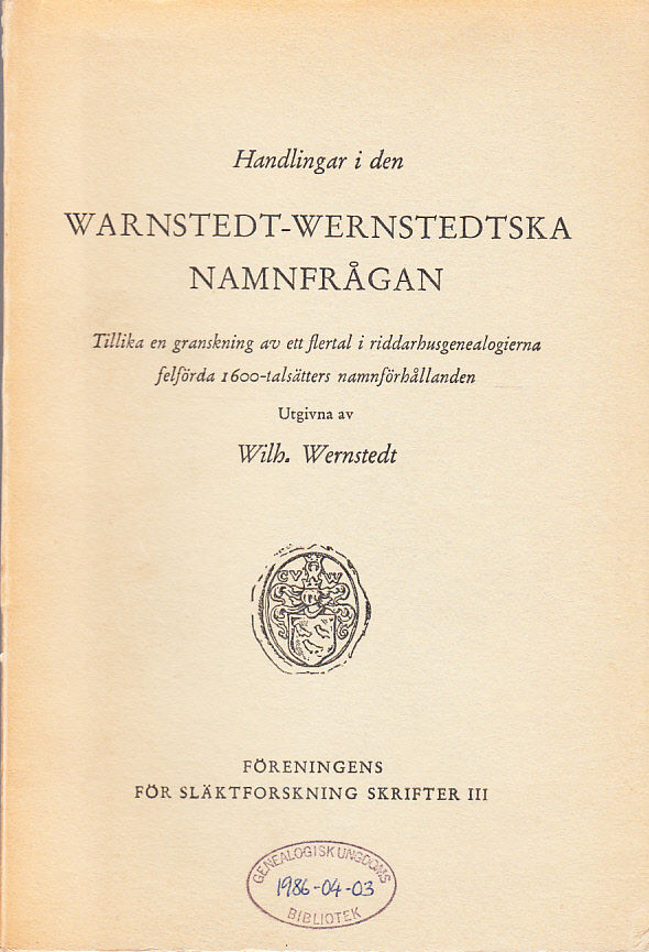 Handlingar i den Warnstedt-Wernstedtska namnfrågan. Tillika en granskning av ett flertal i riddarhusgenealogierna felförda 1600-talsätters namnförhållanden.