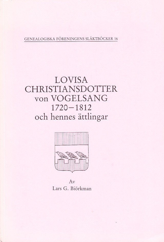 Genealogiska föreningens släktböcker 16.Innehåll: Inledning; Det Vogelsangska fideikommisset; Något om ätten von Vogelsang; Lovisa Christiansdotters ättlingar; Vogelsangska släktstiftelsen; Förkortningar; Litteratur och källförteckning; Personförteckning; Rättelser och tillägg.