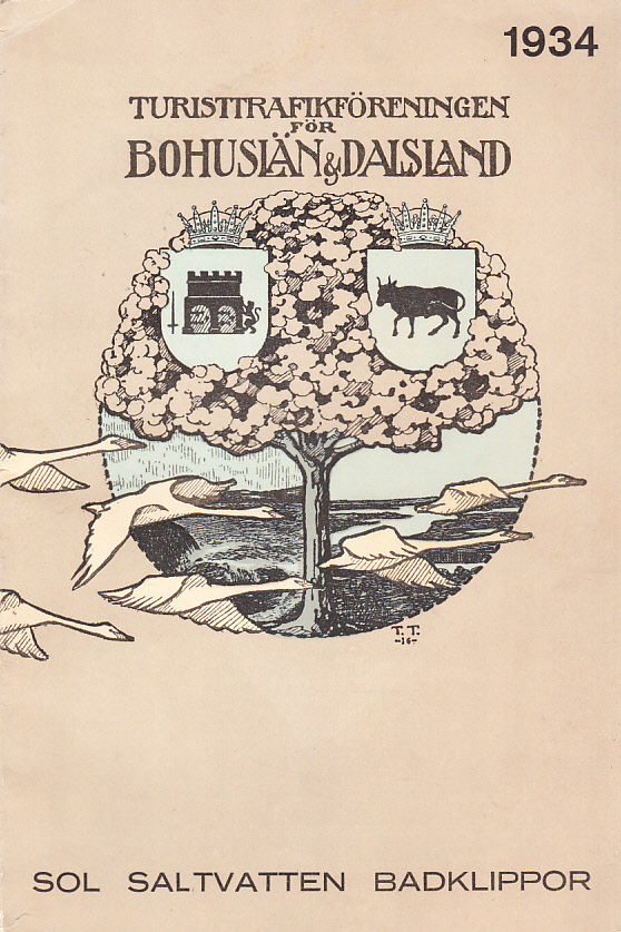 Berthelius ’Bohuslänsk samling’ 434s. Omslagstitel ‘Turisttrafikföreningen för Bohuslän & Dalsland. 1934. Sol Saltvatten Badklippor’. Innehåll: Från Älvsborg till Idefjord, av Gösta Pauve; Ortsbeskrivning; Annonser.