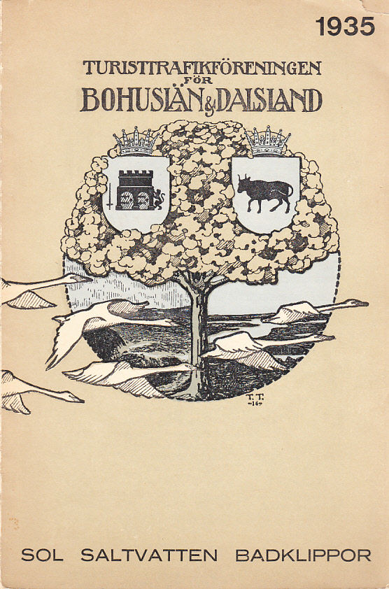 Berthelius ’Bohuslänsk samling’ 434t. Omslagstitel ‘Turisttrafikföreningen för Bohuslän & Dalsland. 1935. Sol Saltvatten Badklippor’. Innehåll: Från Uddevalla ut i fagra Bohuslän, av Gösta Pauve; Kungahällas förstöring år 1135, av Carl Viksten; Ortsbeskrivning; Annonser.