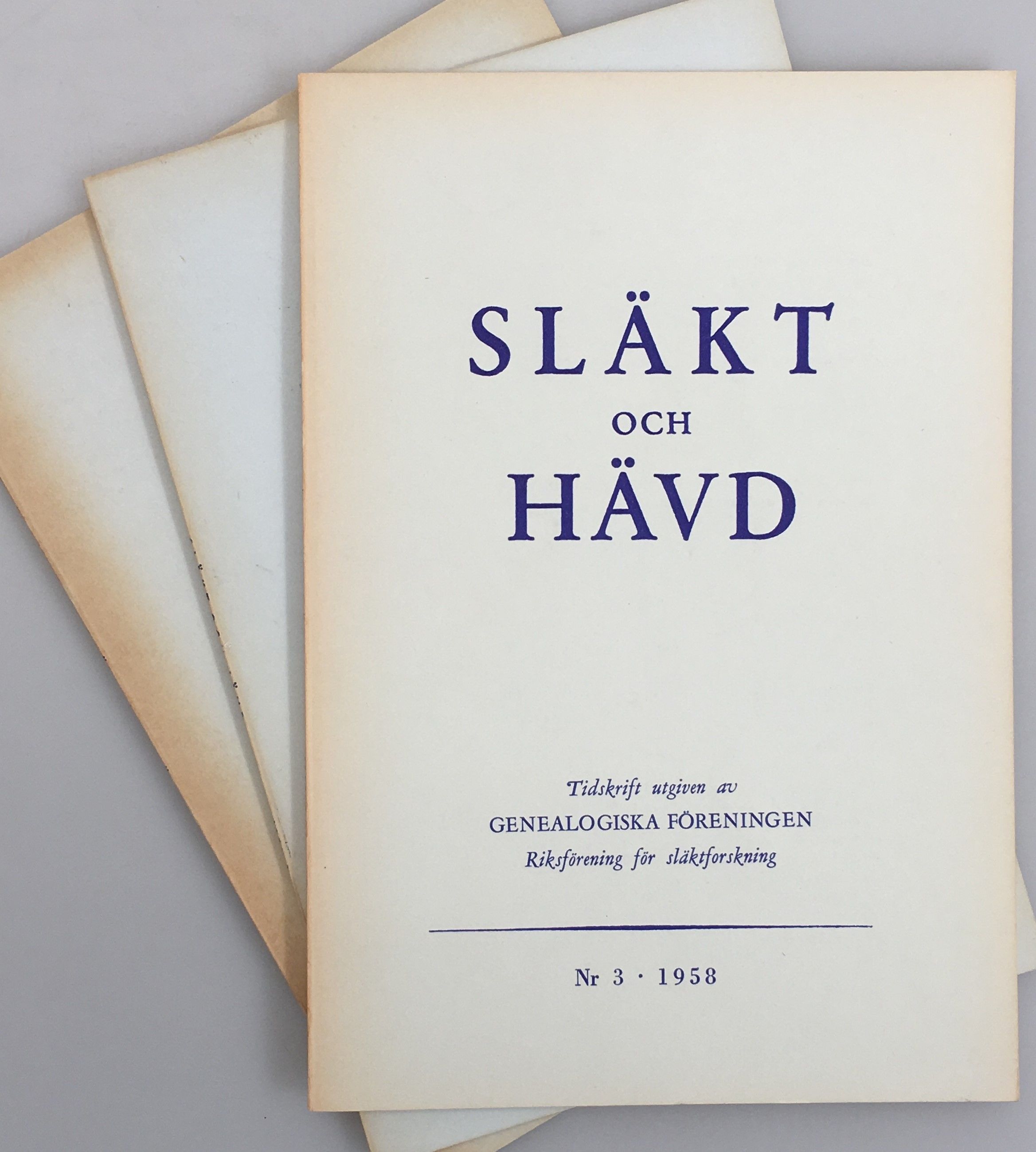Utkom med 2-3 häften / år (2 årgångar utgör 1 band). Personregister till varje band. Innehåll: 1. Väpnaren Tore Bytings svenska avkomlingar i fem led av Jan Eric Almquist; Ätten Andeflychts familjearkiv av C.G.U. Scheffer; Svenskättlingar i Berlin och Angermünde av S. Otto Brenner; ‘Doktor C.V. Robacks’ självbiografi av Paul Wilstadius; Kompletteringar och rättelser till genealogiska arbeten; Svenska köpmän i holländsk kolonialtjänst. 2. Bidrag till släkten de Wahls genealogi av Erik Hellerström; Borgarfamiljenamn i Gränna med geografisk proviniens åren 1670-1700 av Paul Wilstadius; Svenska namn i ett holländskt kyrkoarkiv [av Robert Schmidt]; Tryckta kyrkoboksförteckningar av Birger Lindén; Alfabetisk förteckning över släktnamn, ingående i Collbergska samlingen Gotländska antavlor [av Gustaf Collberg]. 3. Engelbrektssläkten från Kälkesrud av Kjell Magnell; Döbelns mödernefränder av Erik Hellerström; När dog Bogislaus von Chemnitz av Ingel Wadén; Om smålandssläktens Wiboms ursprung av Erik Hård af Segerstad; Genealogiska Förenignen 25 år; Albert Liljas blekingearkiv i Blekinge läns museum av Erik Hellerström.