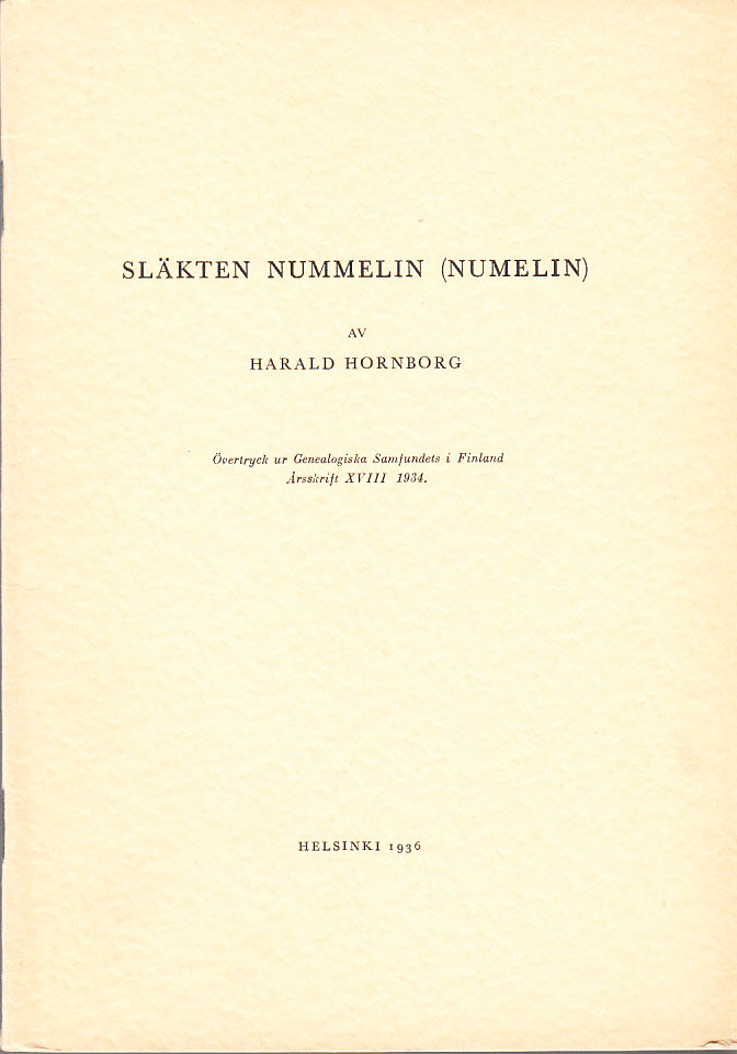 Släkten Nummelin (Numelin). Övertryck ur Genealogiska Samfundets i Finland Årsskrift XVIII 1934 [= omslagstitel].