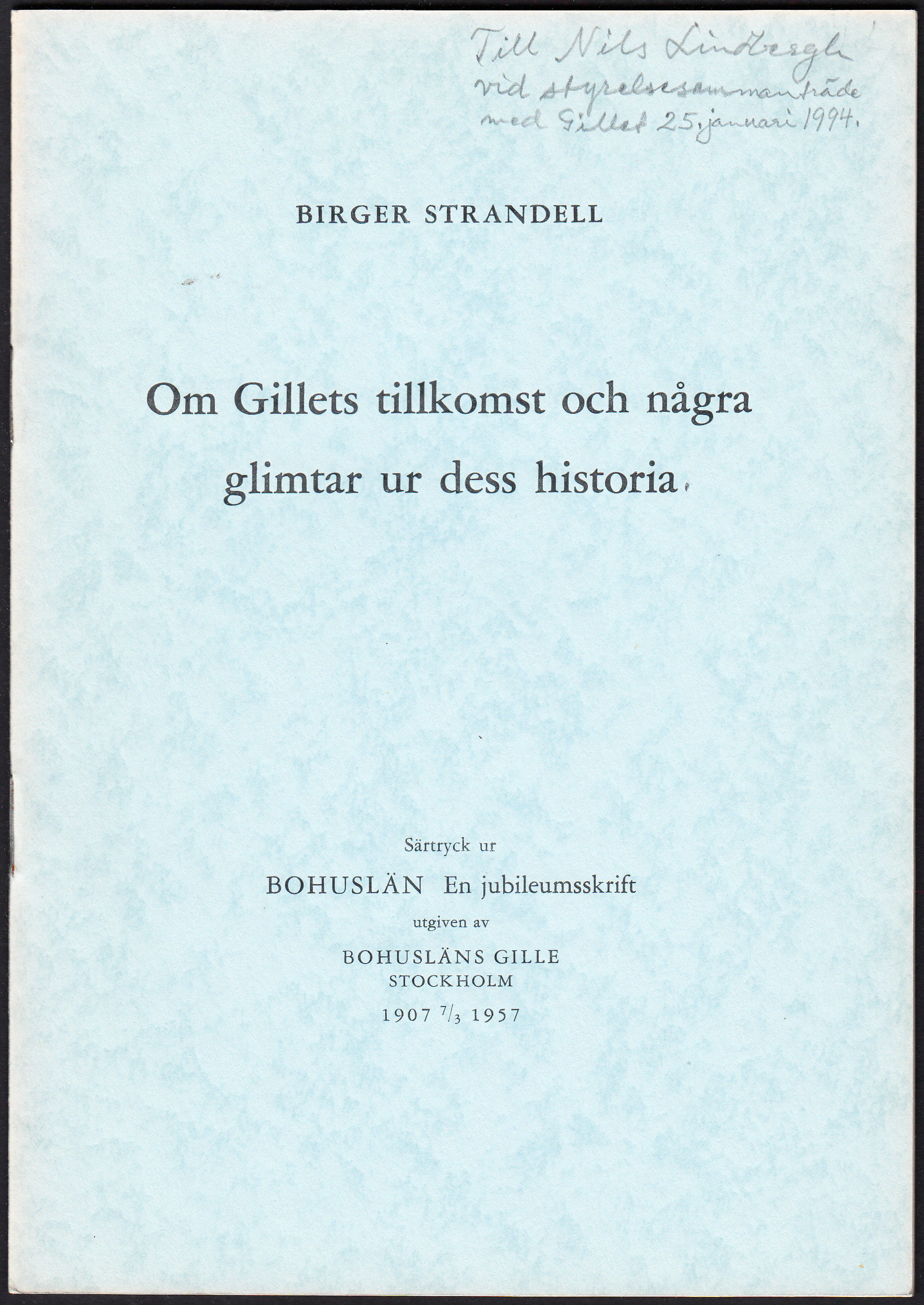 Berthelius ‘Bohuslänsk samling’ 785. Särtryck ur Bohuslän. En jubileumsskrift utgiven av Bohusläns gille, Stockholm, 1907-1957.